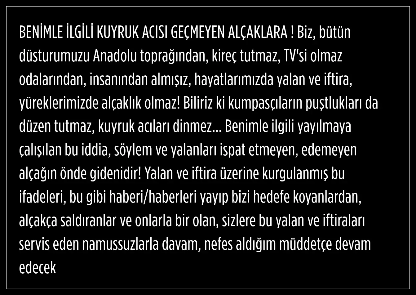 Yalan ve iftiralar üzerine kurgulanmış bu ifadelerin, bu gibi haberleri yayıp kendilerini hedefe koyanlarla, alçakça saldıranlarla, onlarla bir olanlarla, yalan ve iftiraları servis edenlerle davasının nefes aldığı müddetçe devam edeceğini ifade eden Yılmaz, "Başımız dik, alanımız açıktır!" dedi.