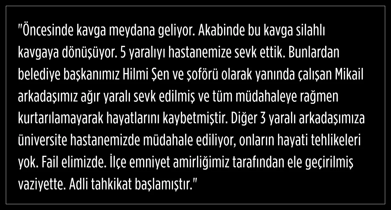Balışeyh Belediye Başkanı Hilmi Şen ile birlikte yaralanan diğer üç kişi, ilçede bulunan hastaneye ambulanslarla götürüldü. İlçe hastanesinde yaralılara ilk müdahale yapıldı.