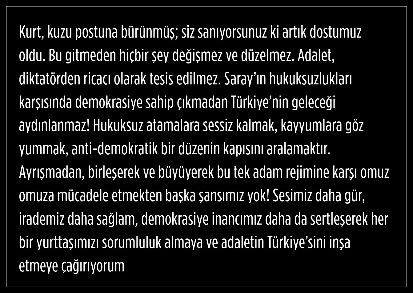 Saray’ın hukuksuzlukları karşısında demokrasiye sahip çıkmadan Türkiye’nin geleceği aydınlanmaz!