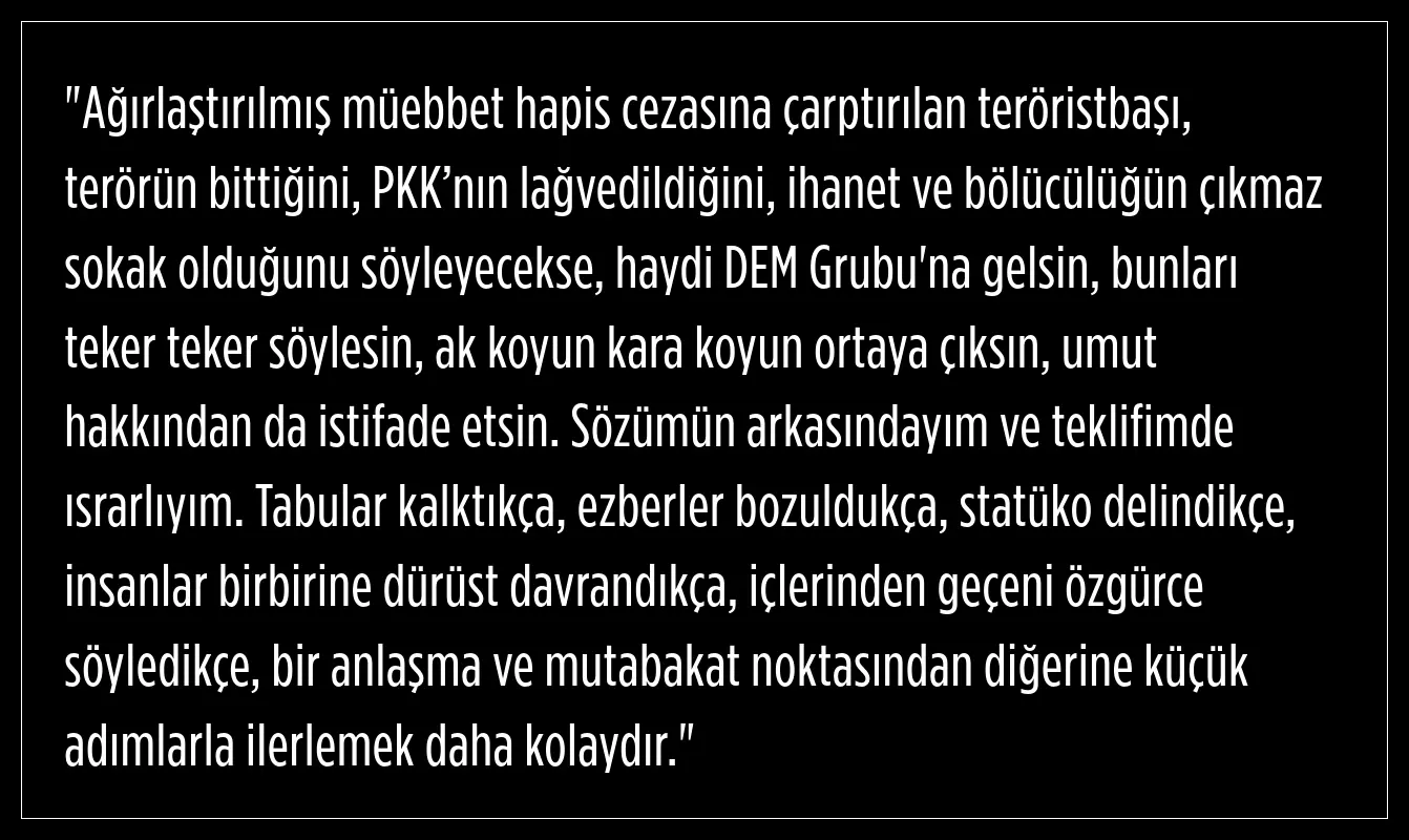 Bahçeli, ağırlaştırılmış müebbet hapis cezasına çarptırılmış olan Öcalan'ın "terörün sona erdiğini söylemesi ve umut hakkından faydalanması" yönündeki teklifinde ısrarcı olduğunu ve sözünün arkasında durduğunu şu sözlerle dile getirdi: