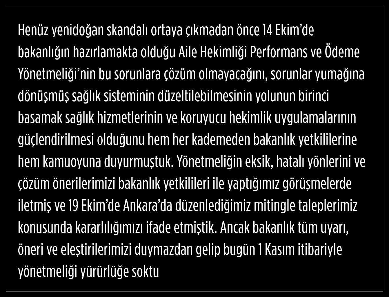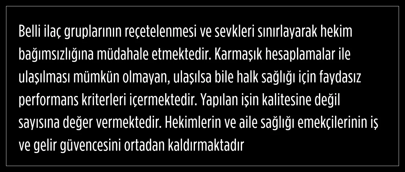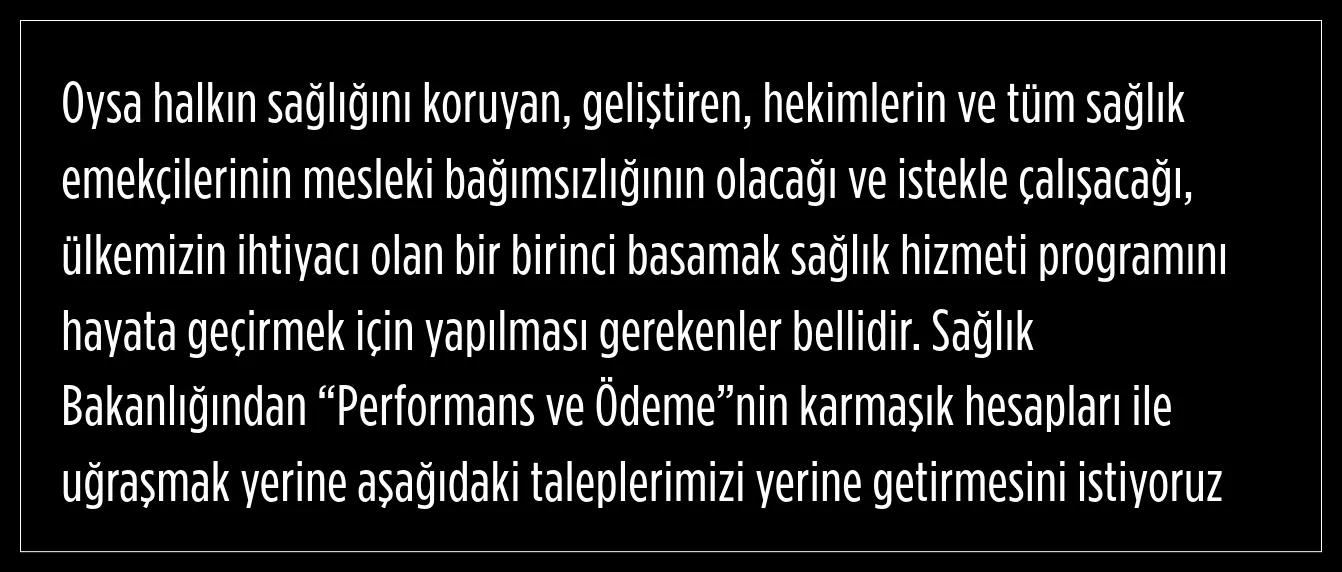 Sağlık Bakanlığının sağlık alanında yaşanan ciddi sorunları çözmek için birinci basamak sağlık hizmetlerini ve koruyucu hekimlik uygulamalarını güçlendirecek yapısal düzenlemeler yapmak yerine “Performans ve Ödeme Yönetmeliği” ile ödeme üzerinden değişiklikler yapmaya çalışmasının sorunların büyüklüğünü kavranamamış olduğunu gösterdiği ifade edilen açıklamada, yürürlüğe giren bu yönetmeliğin halkın sağlığına, hekimlerin ve sağlık emekçilerinin haklarına bir katkı sağlamayacağı belirtildi.
