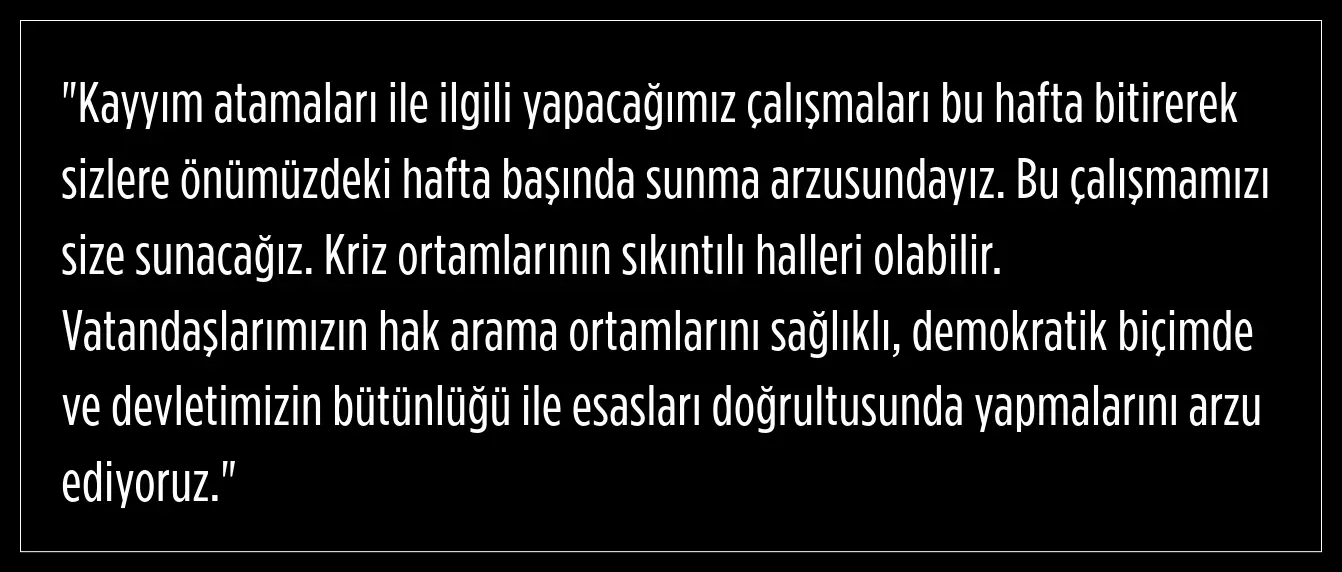 İmamoğlu ve Dervişoğlu, görüşmenin ardından ortak basın açıklaması düzenledi. Açıklamasında, seçme ve seçilme hakkına dikkat çeken İmamoğlu, "Kayyım ataması ile ilgili 2016 yılında yapılan düzenlemenin hukuka aykırı bir şekilde yürütüldüğü açıktır" dedi.