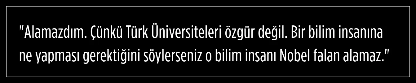 Altaylı, Acemoğlu’na aynı bilgi ve donanım ile Türkiye’de olsa Nobel alıp alamayacağını da sordu. Acemoğlu, Türk üniversitelerinin özgürlükten yoksun olduğunu, bir bilim insanına ne yapması gerektiğinin dikte edilmesinin Nobel gibi başarıların önünde engel olduğunu şu sözlerle dile getirdi:
