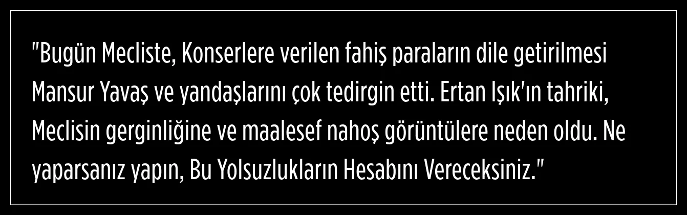 Yüksek fiyatlı konserlerle gündemden düşmeyen Ankara Büyükşehir Belediyesi'nde üçüncü konser tartışması patlak verdi. Ankara Büyükşehir Belediyesi AK Parti Grup Başkanvekili Nihat Yalçın çok konuşulacak bir iddiayı gündeme getirdi. Yalçın, Candan Erçetin ve Murda konseri için 80 milyon TL ödeme yapıldığını açıkladı.