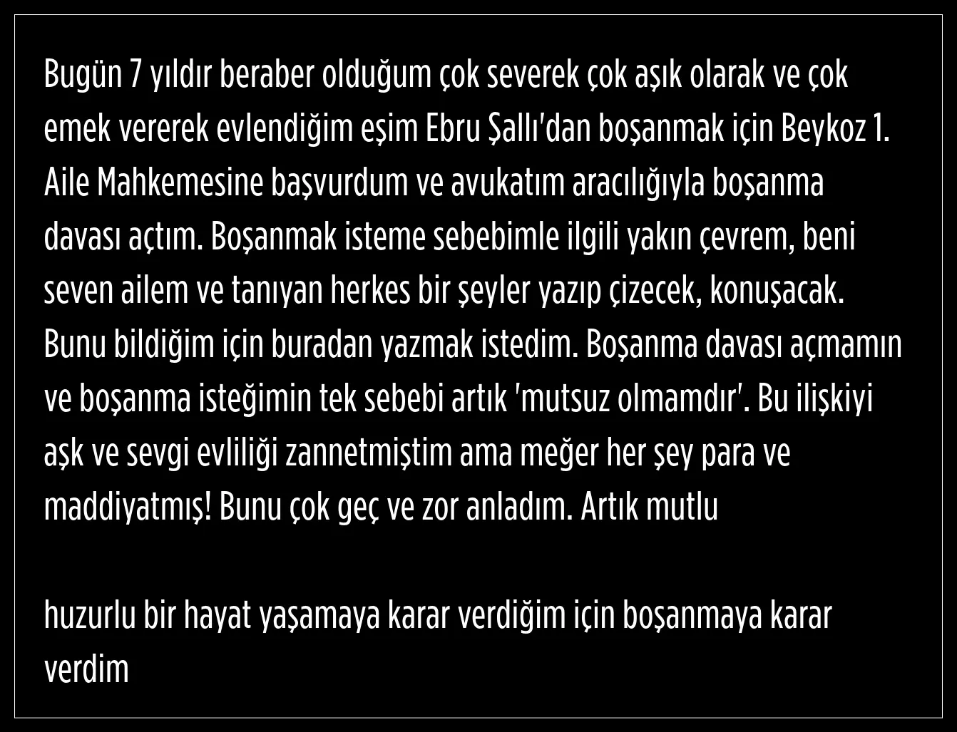 Akkuş, sosyal medya hesabı üzerinden yaptığı açıklamada boşanma davası açtığını duyurdu.