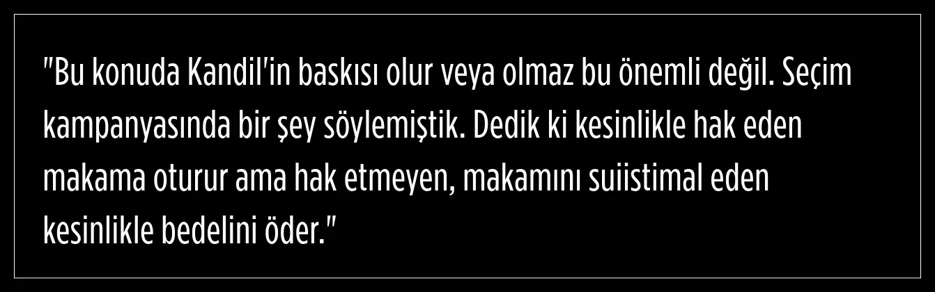 Erdoğan, siyasetçilerin halka, şehre, ilçeye hizmet etme görevlerinin olduğunu vurgulayarak söz konusu siyasetçilerin terör örgütü elebaşlarına hizmet etmemeleri gerektiğine dikkati çekti. Erdoğan, Türk milletinin imkânlarının, Avrupa'da ve Kandil'de bulunan terör baronlarına ya da bölücü terör örgütünün il yapılanmasına peşkeş çekilmesinin göz ardı edilemeyeceğini ifade etti.