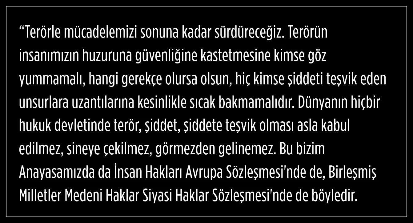 fm ("Terörü hukuk devleti kabul etmez, terörü destekleyeni hukuk devleti kabul etmez. Demokratik bir hukuk devletinde şiddeti teşvik, şiddeti savunma, şiddet yoluyla bir yere gelmeyi demokratik hukuk devleti kabul etmez. Şiddet suçtur, şiddeti teşvik suçtur, terör uzantılarına destek vermek suçtur ve bu bütün dünyadaki demokratik ülkelerde böyledir. Şiddeti destekleyeni yargı önüne çıkarırlar ve yargı onlardan hesap sorar. Bugün de yargımızın şiddeti teşvik edenlerle teröre bulaşanlarla ilgili yaptığı soruşturmaları eleştirmek ve bu konuda yetkili olan yargı mensuplarımızı, Cumhuriyet savcılarımızı adeta tehdit eder vaziyette birtakım konuşmalar yapmak hiç kimseye yakışmaz. Eğer demokratik, hukuk devletine tarafsız ve bağımsız yargıya inanıyoruz derseniz, bunu yapmayacaksınız, o soruşturmaların sonucunu bekleyeceksiniz. O nedenle terörle mücadeledeki kararlılığımızı topyekün birlik ve beraberliğimizi koruyarak, savunmaya devam edeceğiz.”)