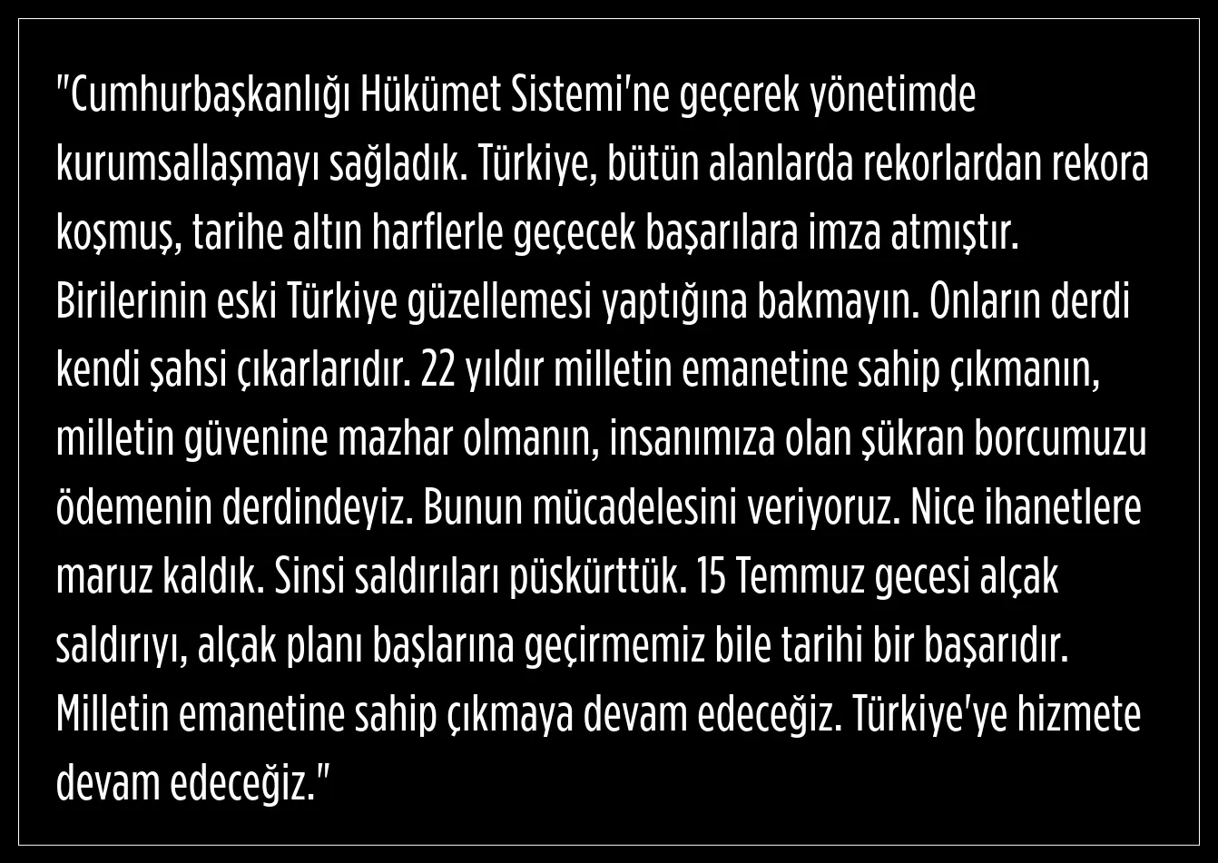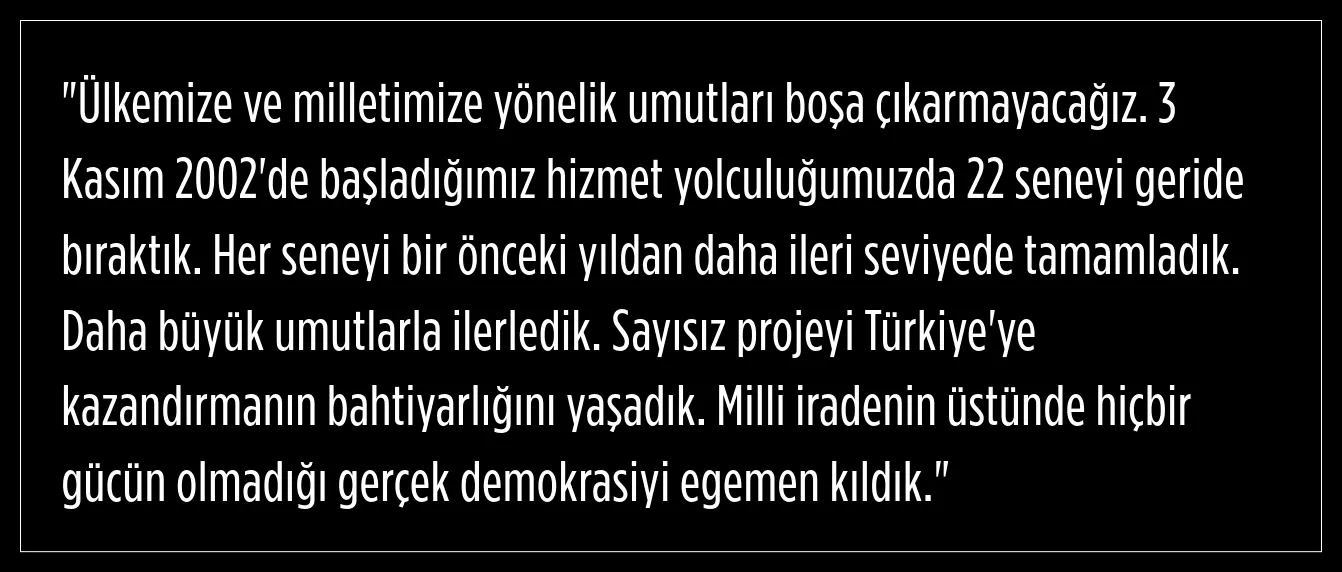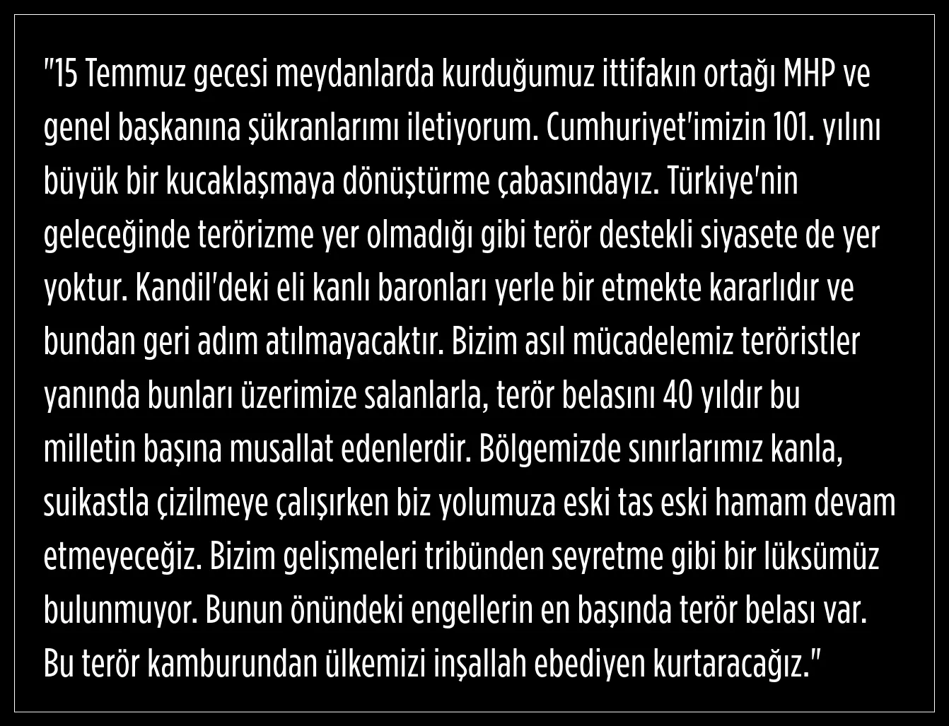 Cumhurbaşkanı Erdoğan MHP lideri Devlet Bahçeli ve MHP'ye teşekkür ederek konuşmasında şunları vurguladı: