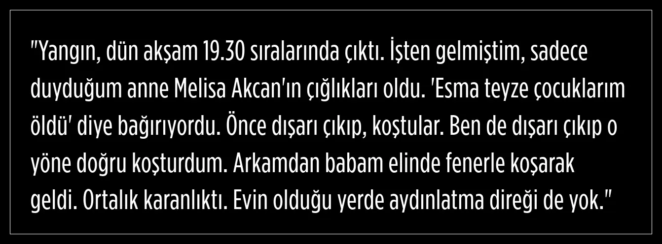 Melisa Akcan'ın dışarıda olduğu sırada evdeki sobanın devrilmesi, yangın çıkmasına neden oldu. Alevler hızla evi sararken içeride mahsur kalan beş kardeş, çevredeki vatandaşlar tarafından fark edildi. Bunun üzerine durum, acil servise bildirildi.