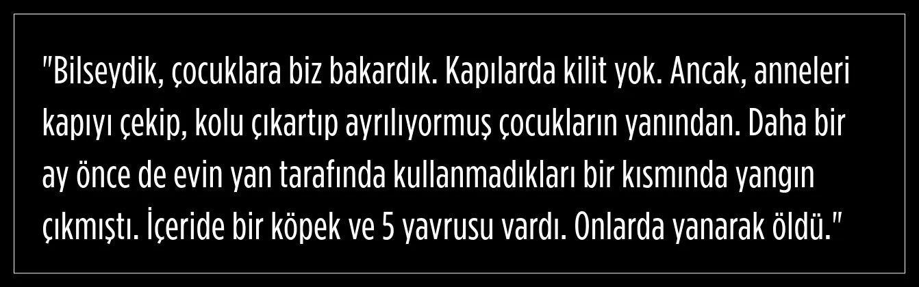 İzmir'in Selçuk ilçesinde 27 yaşındaki Melisa Akcan’ın evdeki beş çocuğunu yalnız bırakarak hurda toplamaya gitmesinin ardından çıkan yangında, yaşları 1 ile 5 arasında değişen beş çocuk hayatını kaybetti. Yangında can veren çocuklardan geriye sadece oyuncakları kaldı. Pencere kenarındaki sapanlar ve balkona asılı kaydırak ise bu trajik olayın izlerini gözler önüne serdi.