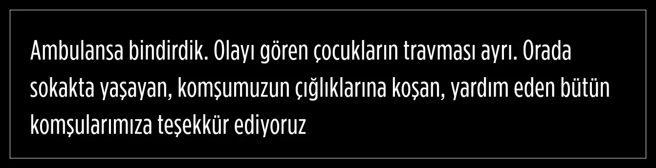 Üzücü bir olay olduğunu belirten Çiğdem Mahallesi Muhtarı Özlem Ergon Cerit, saldırıya uğrayan Prof. Dr. Meliha Yılmaz'ın yanlarına gittiklerinde çok kötü olduğunu ve kanlar içerisinde ambulans beklediğini ifade etti.