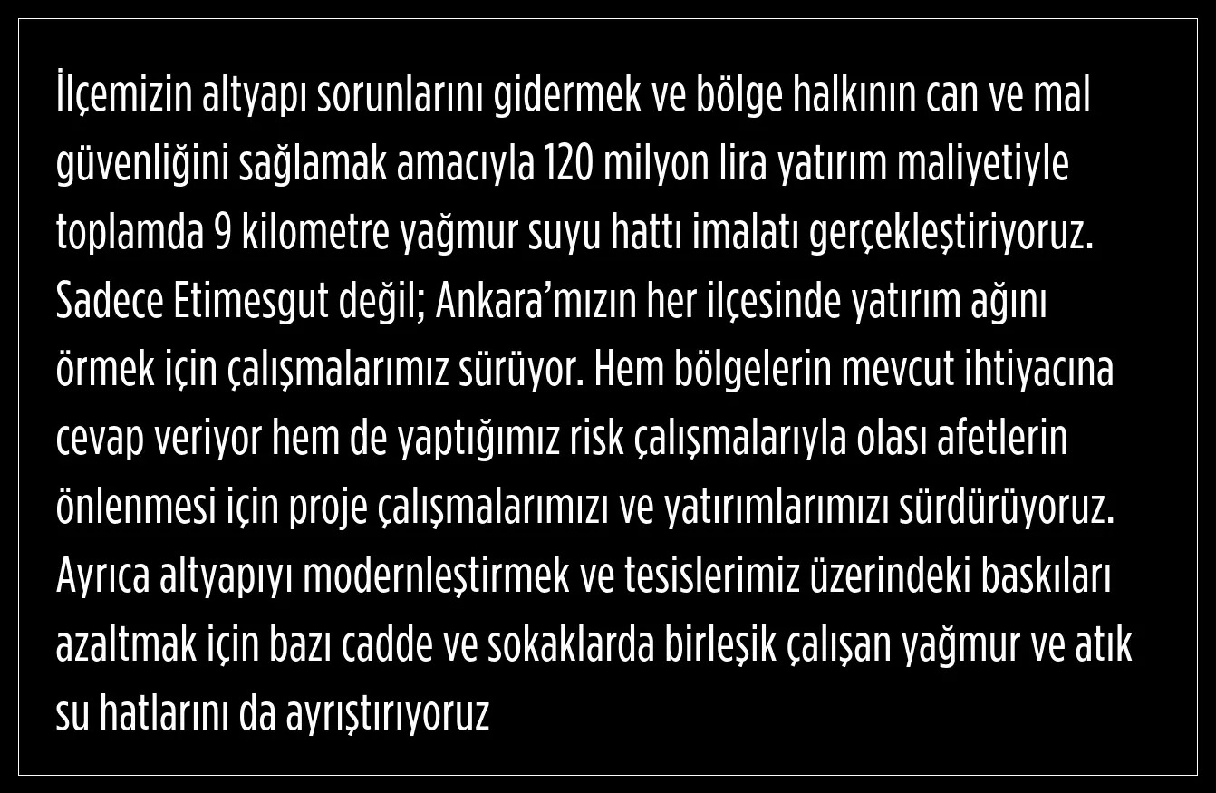 Bu çerçevede Etimesgut ilçesi için özel bir plan devreye alındı. Bölgedeki Ayyıldız, Oğuzlar ve Atakent Mahallelerinde yeni yağmur suyu hatları yapılıyor.
