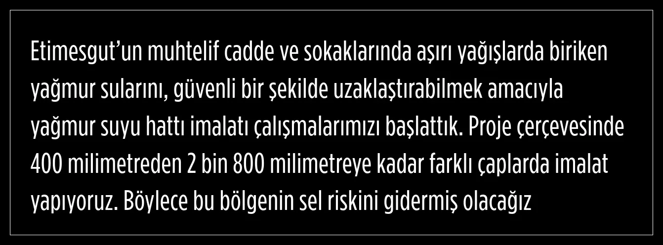 Yaklaşık 120 milyon TL bütçeyle yürütülen altyapı yatırımı kapsamında, Etimesgut’a toplamda 9 kilometrelik yeni yağmur suyu hattı kazandırılacak.