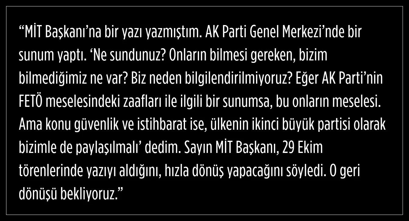 Milli İstihbarat Teşkilatı (MİT) Başkanı İbrahim Kalın’ın, FETÖ lideri Fethullah Gülen’in ölümü sonrası Cumhurbaşkanı Recep Tayyip Erdoğan başkanlığında 22 Ekim Salı günü toplanan AKP Merkez Yürütme Kurulu’nda (MYK) sunum yaptığı ortaya çıktı. Bu gelişme, CHP kanadında tepkiyle karşılandı.