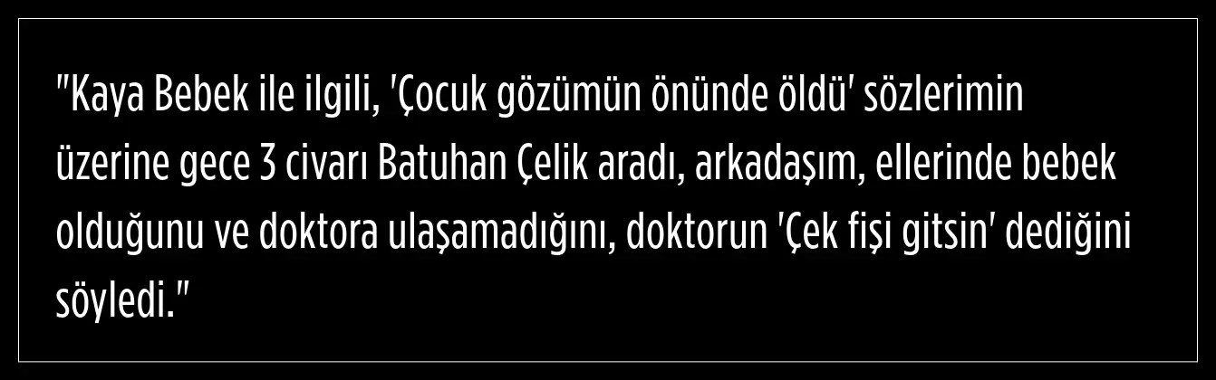 Doktorun adının Rıza olduğunu ancak kendisini tanımadığını ve çocuk doktoru olarak bildiğini dile getiren Taşçı, hastanın kötü olduğunu ve bu nedenle telefondan yardım etmeye çalıştığını belirtti. Taşçı, söz konusu bebeğin öldüğünü kaydederek şu ifadeleri kullandı: