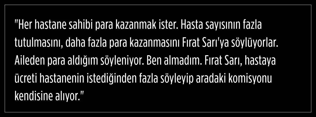 Taşçı, çete lideri Fırat Sarı’nın, hastane ücretlerini ailelere yüksek söyleyip aradaki farkı kendi lehine komisyon olarak aldığını şu sözlerle dile getirdi: