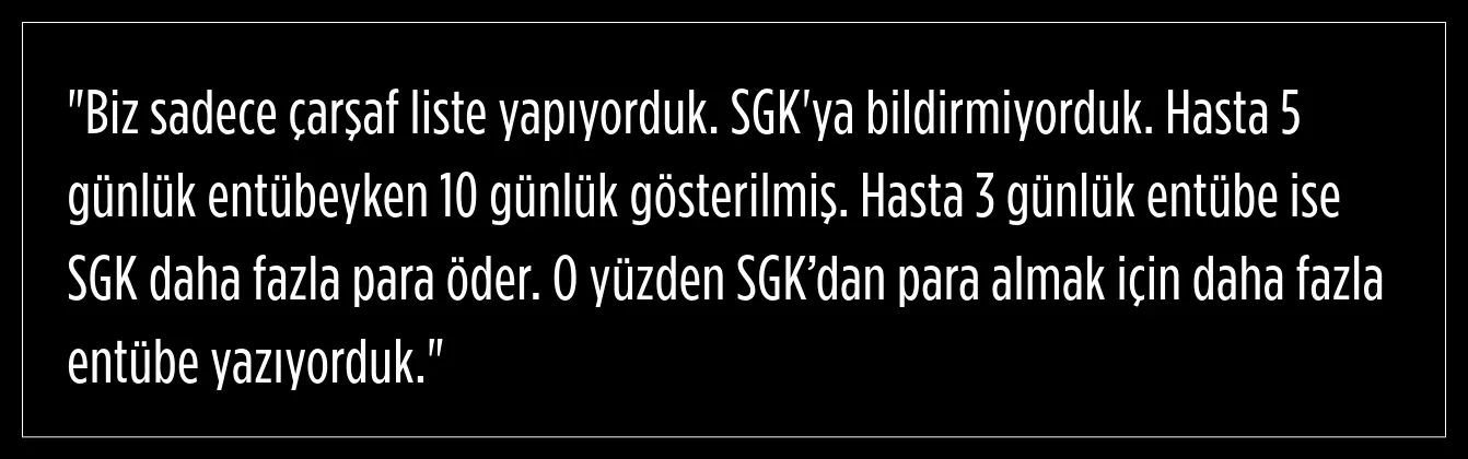 Taşçı, yoğun bakım ünitelerinin doluluk oranlarının hastaneler için maddi kazanç sağladığına dikkat çekerek bu nedenle hastaneleri doldurmalarının istendiğini söyledi. Bunu usulsüz sevk veya fazladan yatış ile gerçekleştirdiklerini aktaran Taşçı, böylece SGK'dan (Sosyal Güvenlik Kurumu) biraz daha fazla para alındığını ifade etti.