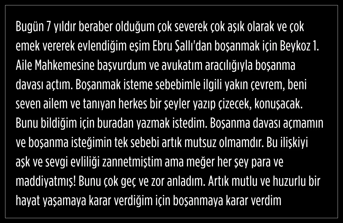 Uğur Akkuş, geçtiğimiz günlerde sosyal medya hesabı üzerinden yaptığı açıklamada Ebru Şallı'dan boşanmak için Beykoz 1. Aile Mahkemesine başvurduğunu ve avukatı aracılığı ile boşanma davası açtığını söyledi.