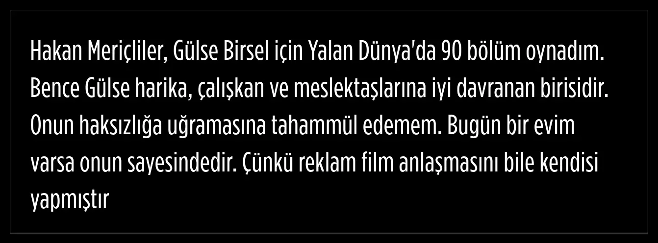 Gülse Birsel'e Yalan Dünya dizisinde birlikte rol aldığı meslektaşı Hakan Meriçliler'den destek geldi.