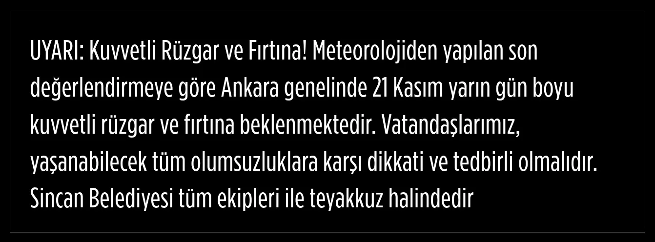 Sincan Belediyesi, etkili olan kuvvetli rüzgar ve fırtınaya karşı bir uyarıda bulundu.