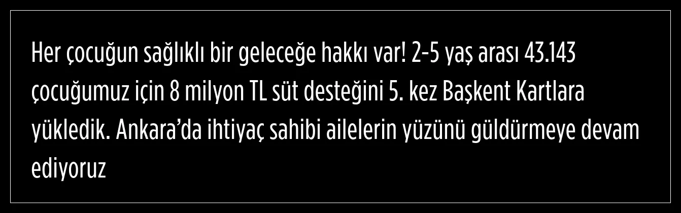 Ankara Büyükşehir Belediyesi, çocuklara 5. kez süt desteğinde bulundu. Proje kapsamında 43.143 çocuğa destek sağlandı.