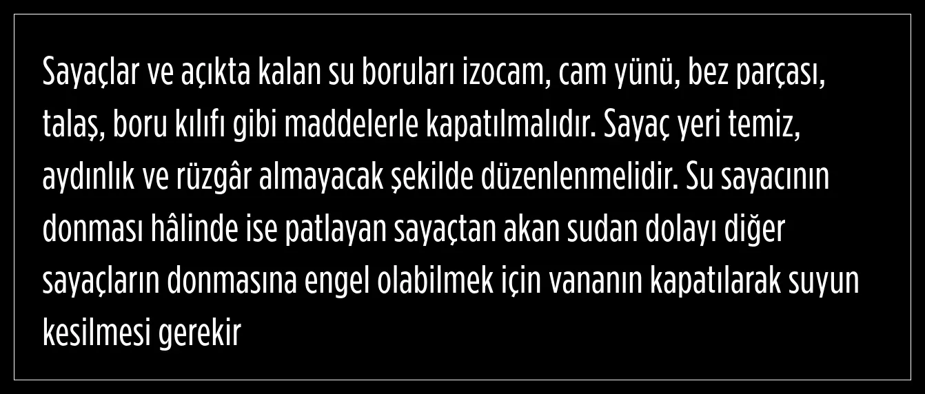 ASKİ yetkilileri, sayaçların bulunduğu alanların soğuk hava akımlarından korunması gerektiğini vurgulayarak şu önerilerde bulundu: