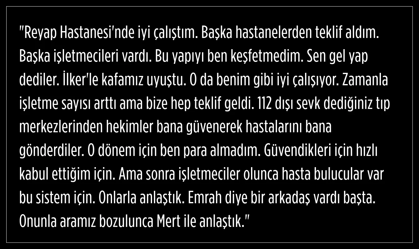 Srı, 112 Çağrı Merkezi'nde çalışan şahıslar ile ortak hareket ettiklerine dair suçlamaları reddetti. 112 sevk zincirini bozarak ve rüşvet vererek hiçbir şekilde hasta almadıklarını öne süren Sarı, şu ifadeleri kullandı: