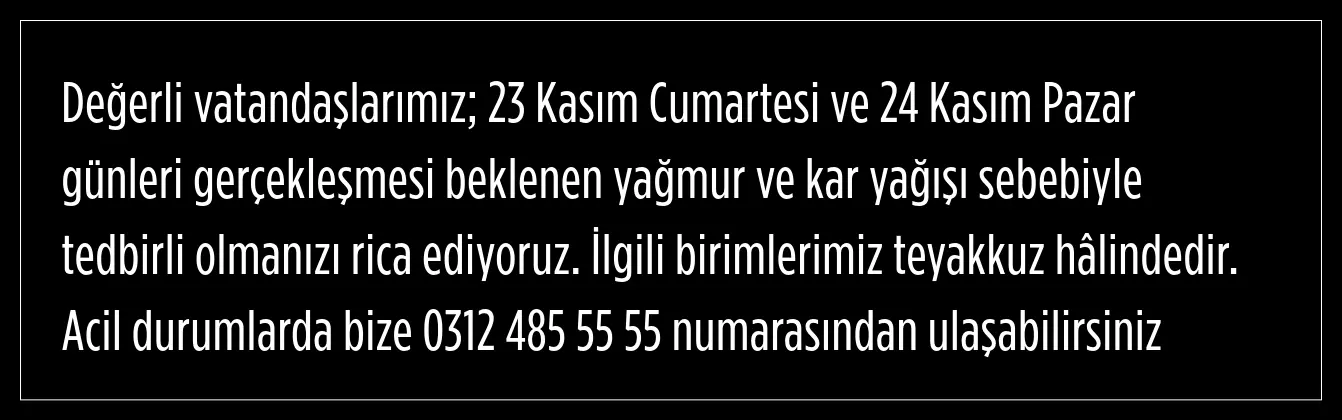 İlgili birimlerin teyakkuz halinde olduğu ifade edilen açıklamada, vatandaşların acil durumlarda 0312 485 55 55 nolu telefon numarasından belediyeye ulaşılabileceği aktarıldı.