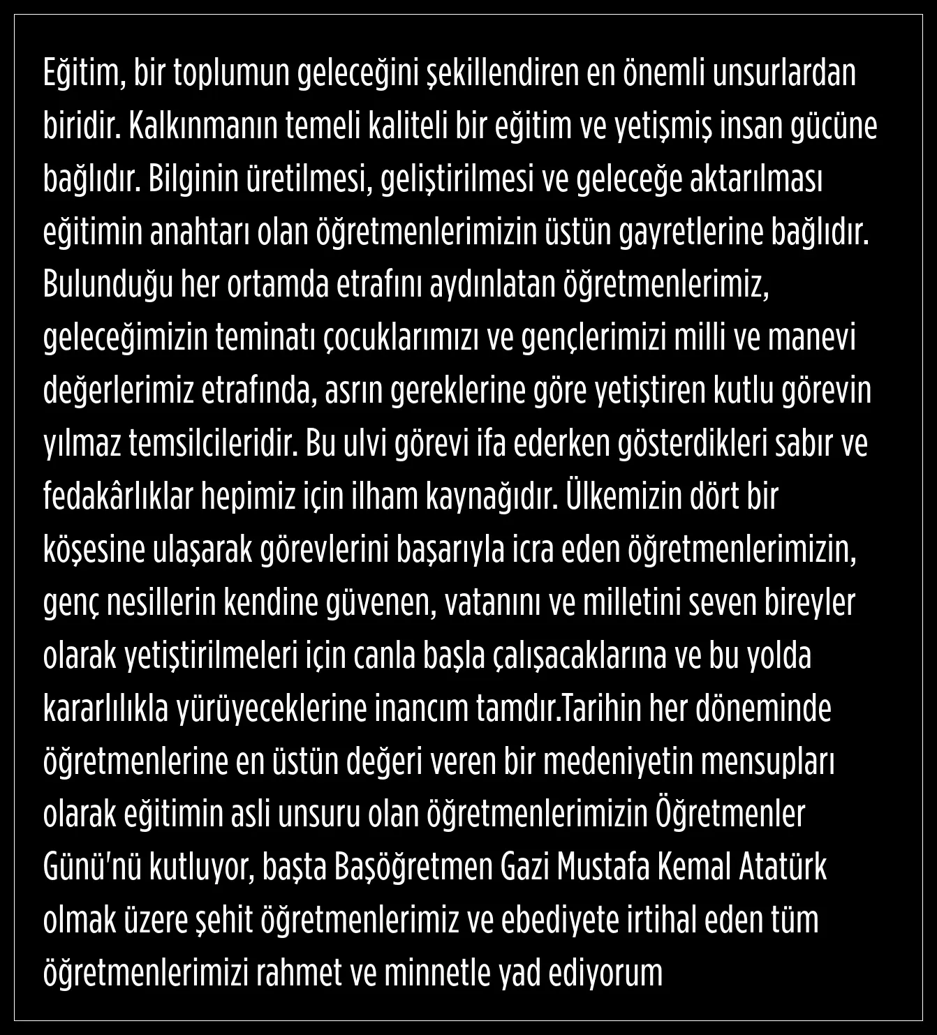 Vasip Şahin, öğretmenlerin geleceğin teminatı olan çocukları ve gençleri, milli ve manevi değerler etrafında asrın gereklerine göre yetiştiren kutlu görevin yılmaz temsilcileri olduğunu aktardı.