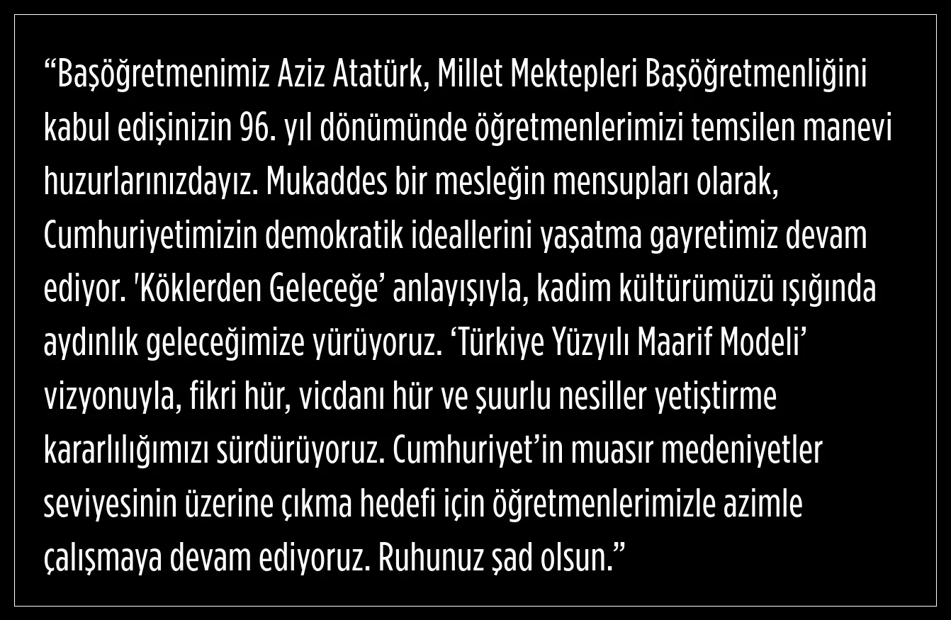 Bakan Yusuf Tekin, daha sonra Misak-ı Milli Kulesi’ne geçerek Anıtkabir Özel Defteri’ni imzaladı. Tekin, deftere yazdığı mesajda öğretmenlerin Cumhuriyet’in ideallerini yaşatma konusundaki kararlılığını ve "Türkiye Yüzyılı Maarif Modeli" vizyonunu dile getirdi.