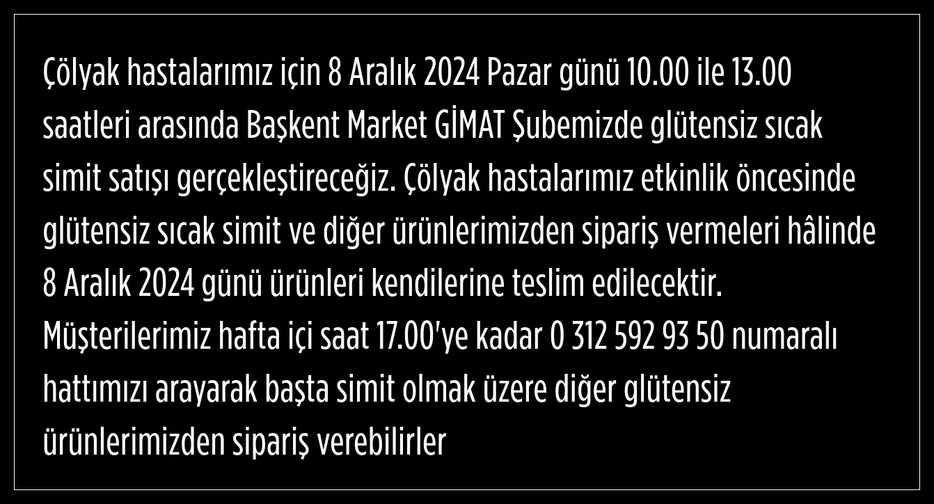 Glütensiz simit almak isteyen simit hastaları, Başkent Market GİMAT Şubesinden ulaşabilecek.