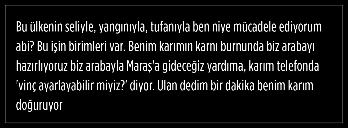 "Bu ülkenin seliyle, yangınıyla, tufanıyla ben niye mücadele ediyorum abi? Bu işin birimleri var"