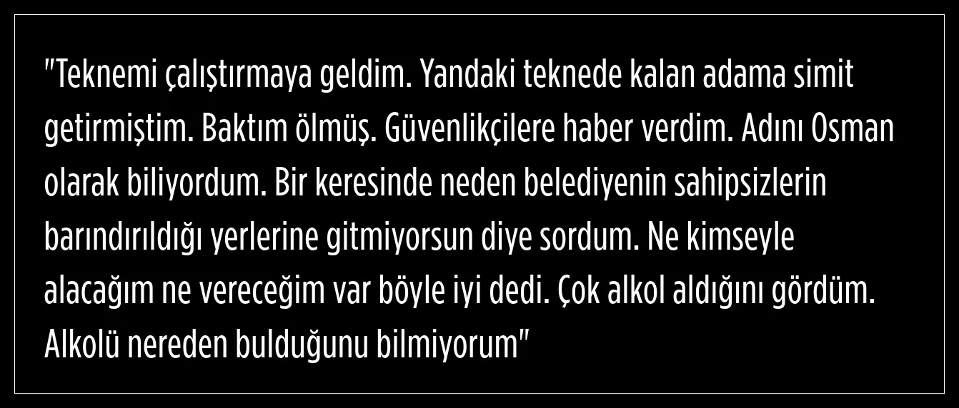 Olay yerine gelen polis ve sağlık ekipleri, teknede hareketsiz duran bir erkeğin yaşamını yitirdiğini tespit etti. Üzerinden kimlik çıkmayan cesedin 45 yaşlarında bir kişiye ait olduğu belirlendi.