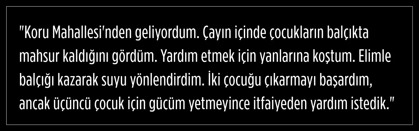 Olay, dün saat 15.00 sıralarında meydana geldi. Hacı Musa Çayı'nda oynayan çocuklar, balçığa saplanarak hareketsiz kaldı. Çocuklar, balçıktan çıkmaya çalışırken çevreden geçen Mustafa Çetiner olayı fark etti. Durumu hemen yetkililere bildiren Çetiner, araç lastiği ve odun gibi malzemelerle iki çocuğu kurtardı. Üçüncü çocuk ise polis ve itfaiyenin koordinasyonuyla çıkarıldı.