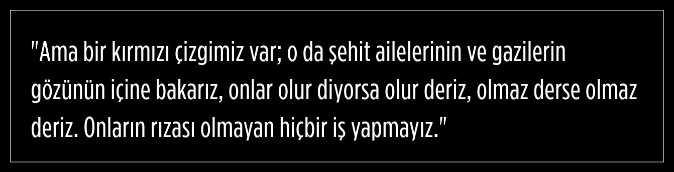 Parti olarak "kırmızı çizgi"ye sahip olduklarını ifade eden Özel, şehit ailelerinin ve gazilerin onayı olmadan hiçbir iş yapmayacaklarını şu sözlerle dile getirdi: