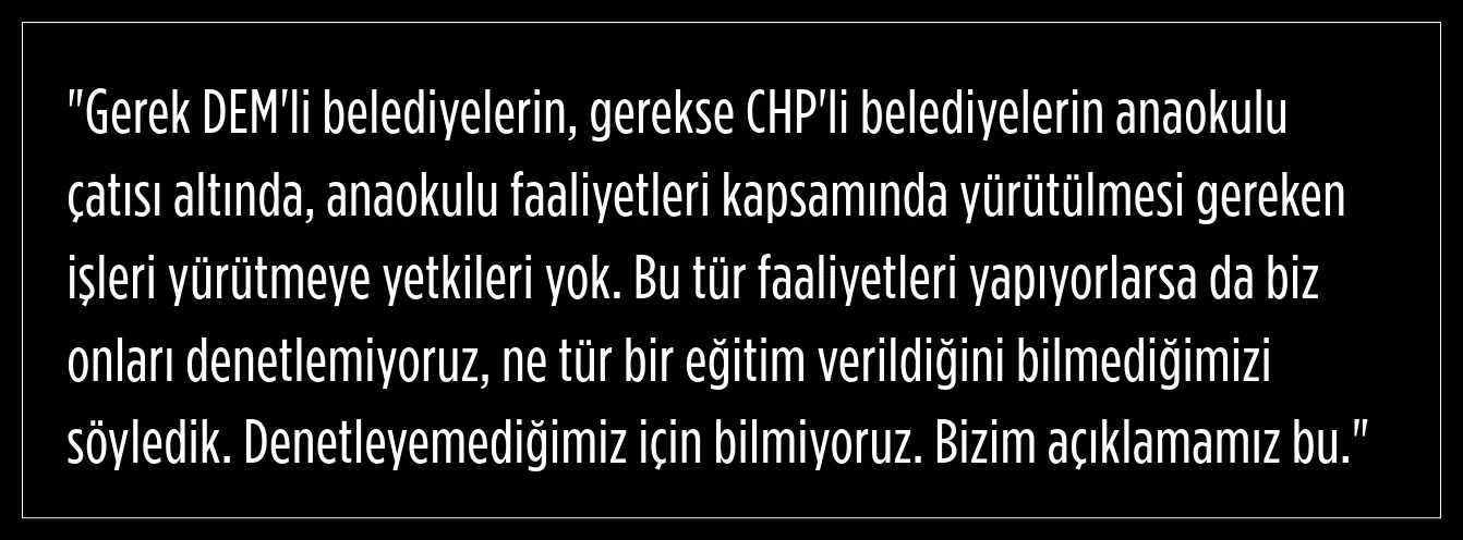 MEB'e (Milli Eğitim Bakanlığı) bağlı Özel Öğretim Kurumları Genel Müdürlüğü personelince yapılan saha incelemelerinde, belediyelere ait kreşlerde 5580 sayılı Özel Öğretim Kurumları Kanunu’na tabi okul öncesi eğitim kurumlarının programında bulunan eğitim-öğretim faaliyetlerinin ve etkinliklerin yürütüldüğü tespit edildi. Bunun üzerine Çevre, Şehircilik ve İklim Değişikliği Bakanlığına bir talep iletilerek, bu durumun Anayasa’ya aykırı olduğu vurgulandı.