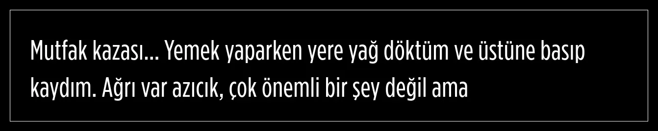 Elinin sargılı olduğu görülen Selin Şekerci'nin ev kazası geçirdiği öğrenildi. Oyuncu, yemek yaptığı sırada yere yağ döküldüğünü ve üstüne basarak kaydığını ifade etti.