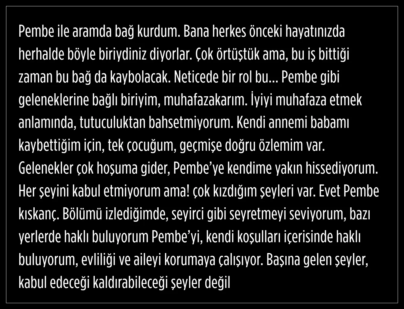 Dizideki karakteriyle ilgili açıklamalar yapan Taşçıoğlu, Pembe ile arasında bağ kurduğunu ifade etti.