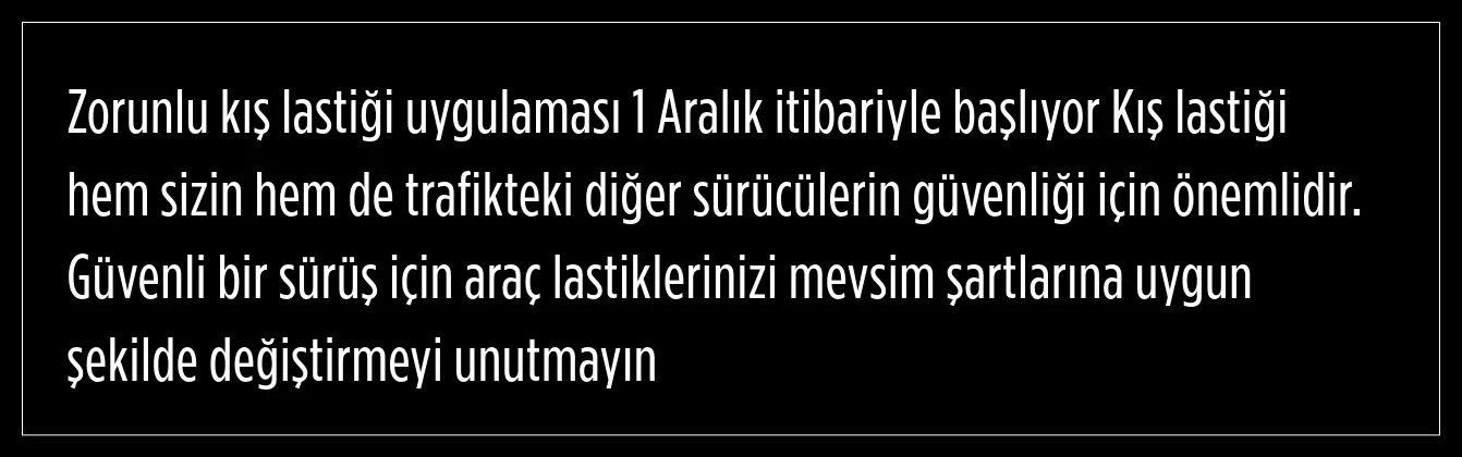 Kış lastiğinin hem sürücü hem de trafikteki diğer sürücülerin güvenliği için önemli olduğu belirtilen açıklamada araç lastiklerinin mevsim şartlarına uygun şekilde değiştirilmesi gerektirildiği belirtildi.