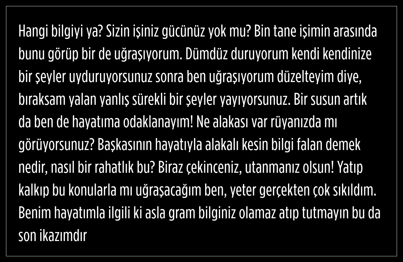 Çok sıkıldığını ifade eden Müjde Uzman, "Atıp tutmayın bu da son ikazımdır" ifadelerini kullandı.