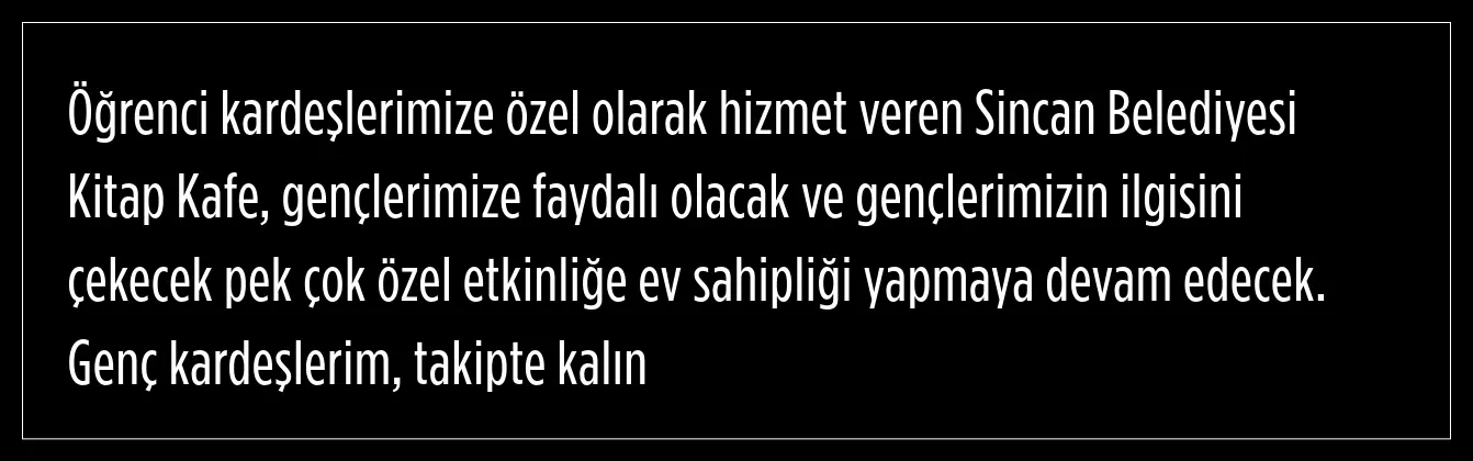 Sincan Belediyesi, gençlerin kitap okuyup dinlenebileceği ve aynı zamanda çeşitli etkinliklere katılabileceği yeni bir projeyi geçtiğimiz haftalarda hayata geçirdi.