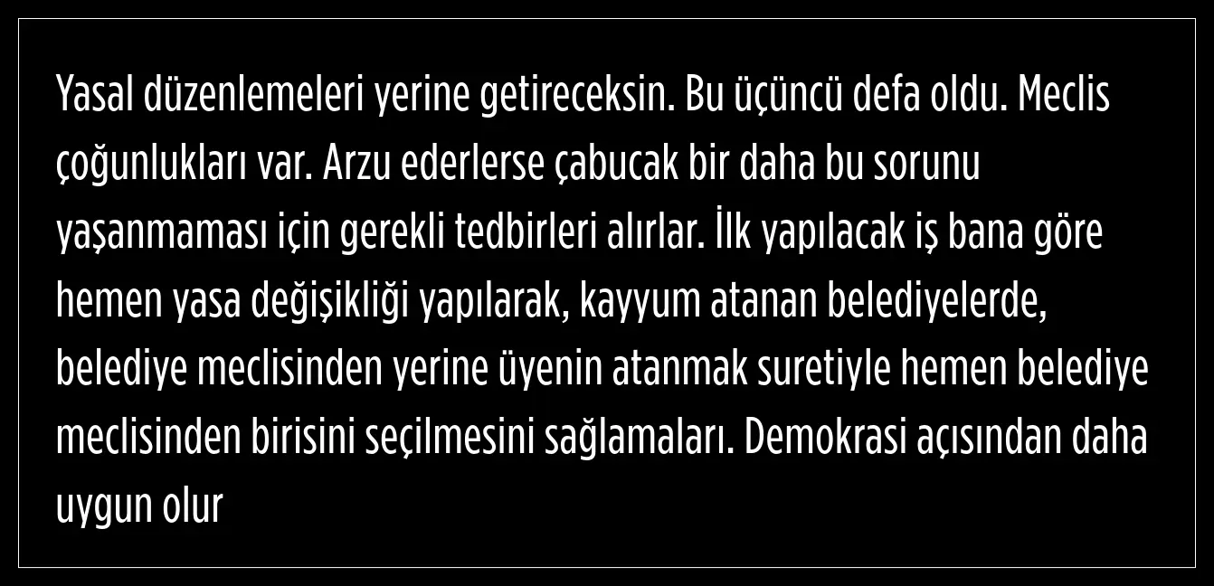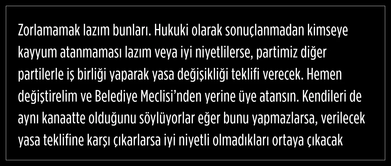 Mansur Yavaş, yasa değişikliği yapılması gerektiğini ifade ederek, kayyum yerine belediye meclisinden atama yapılmasının demokrasi açısından daha uygun olacağını söyledi.