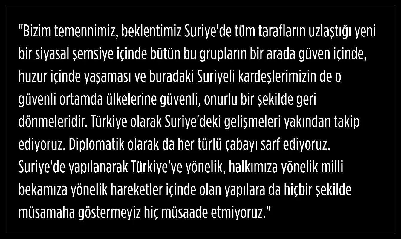 “Komşumuzda olan her şey bize doğrudan yansıyor. Türkiye olarak temennimiz, Suriye’ye huzur ve istikrarın gelmesidir. Bu, hem Suriye’deki kardeşlerimiz hem de bizim için çok daha olumlu bir ortam yaratacaktır. Bunun yolu da tüm kesimleri kucaklayan bir siyasi çözümdür. İnancı, mezhebi veya etnik yapısı ne olursa olsun, hiçbir insan ya da toplum kendini güvende hissetmediği sürece Suriye’de istikrar sağlanamaz.”