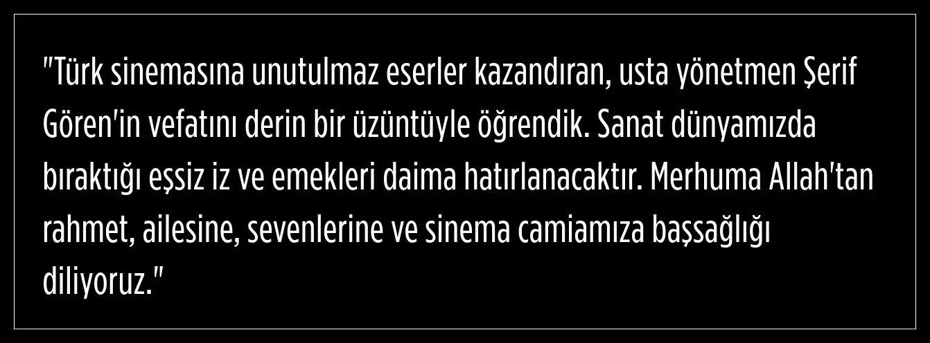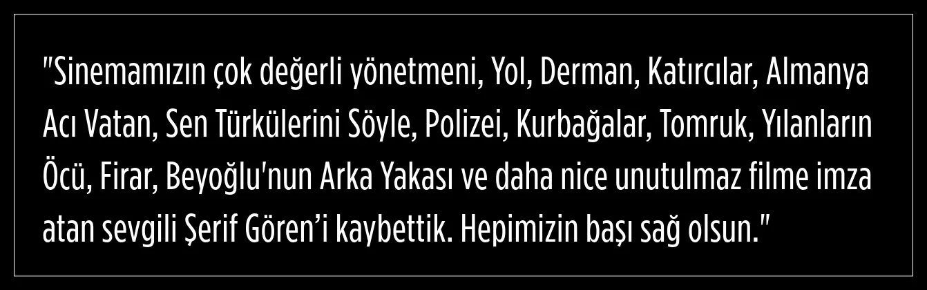 Şerif Gören’in ölümü, Türk sinemasında derin bir boşluk bıraktı. Yalnızca ödülleri ve başarılarıyla değil, topluma ayna tutan filmleriyle de hatırlanacak. Gören, eserleriyle sadece Türkiye'de değil, dünya çapında bir iz bıraktı.