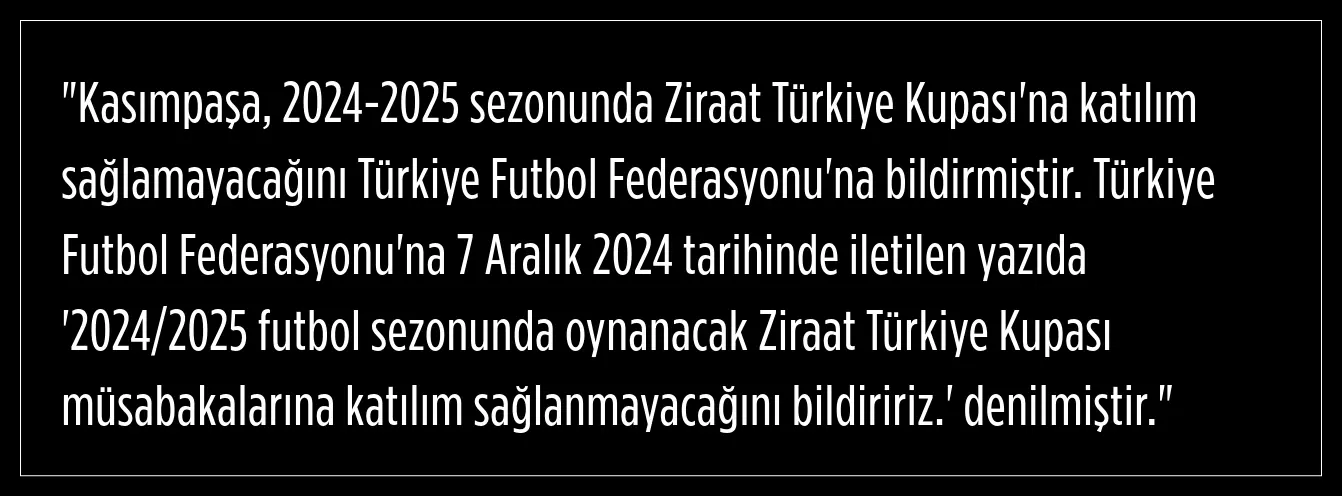 Kasımpaşa, 2024-2025 sezonunda Ziraat Türkiye Kupası'na katılmayacağını Türkiye Futbol Federasyonu'na iletti. TFF, konuyla ilgili gerekli değerlendirmelere başlayacağını duyurdu.