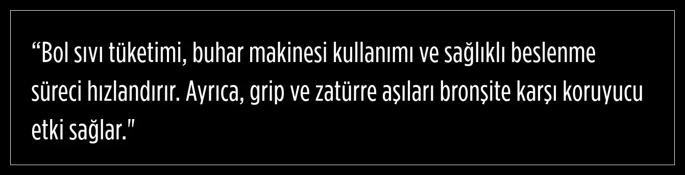 Bronşitin tedavisinde kullanılan doğal yöntemleri sıralayan Dr. Karadeniz, “Bol sıvı alımı, bal, zencefil ve limon çayı gibi yöntemler solunum yollarını rahatlatır. C vitamini açısından zengin meyveler bağışıklığı desteklerken, tavuk suyu çorbası ve sebze çorbası mukus üretimini azaltır” dedi.