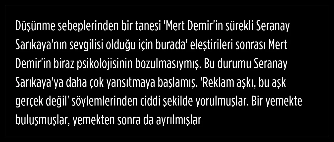Serenay Sarıkaya ile Mert Demir'in ilişkilerini noktaladığı öğrenildi. Sarıkaya ve Demir çiftinin ayrılığının perde arkası ortaya çıktı.