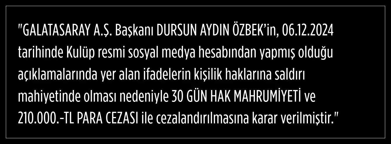 Galatasaray Başkanı Özbek, Türkiye Futbol Federasyonu tarafından 30 gün hak mahrumiyeti ile cezalandırıldı. TFF tarafından yapılan açıklamada, kulübün sosyal medya hesaplarından paylaşılan ifadelerin "kişilik haklarına saldırı" niteliğinde olduğu belirtildi.