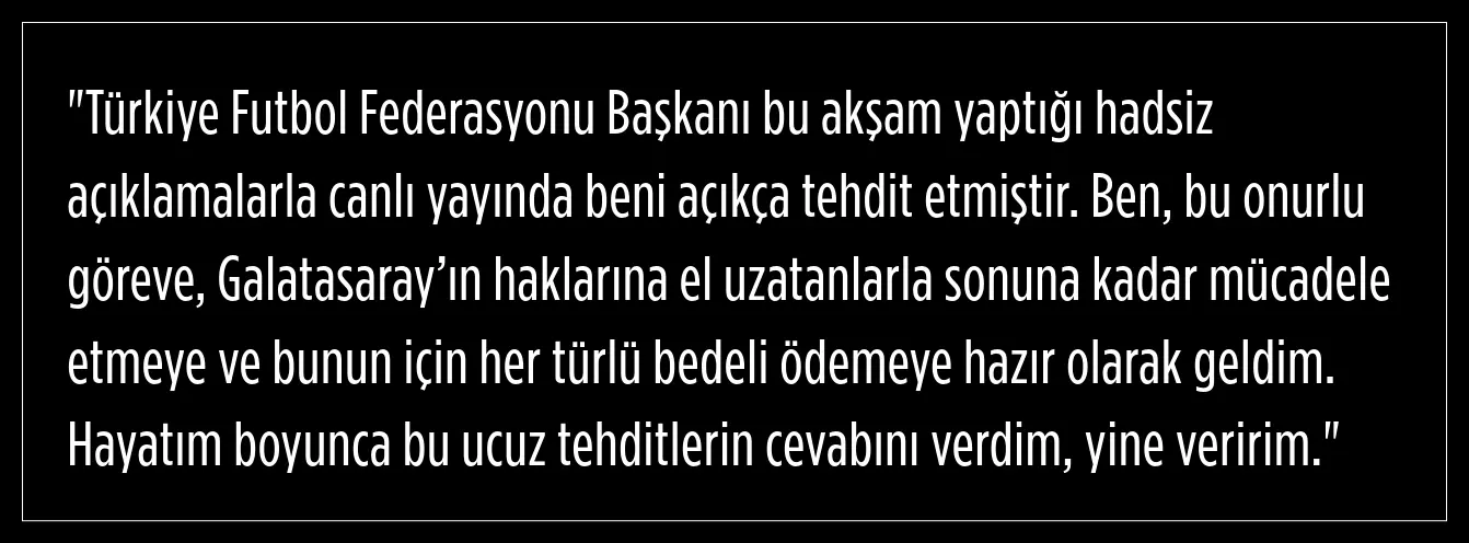 Dursun Özbek, 6 Aralık 2024 tarihinde yaptığı açıklamada, TFF Başkanı İbrahim Hacıosmanoğlu'nun kendisini canlı yayında tehdit ettiğini öne sürmüştü.