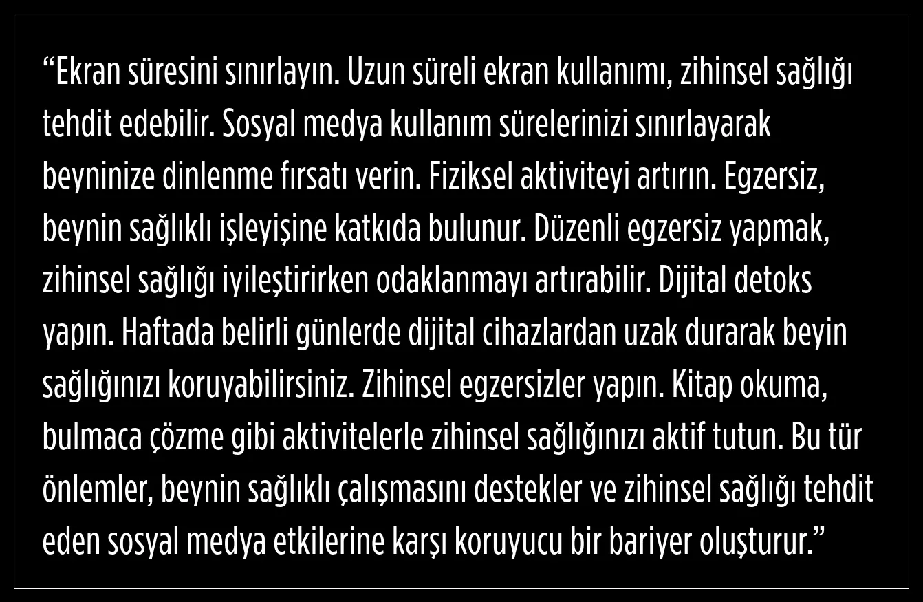 Üstüner, “Sosyal medya kullanımını sınırlandırmak ve dijital detoks yapmak bu etkileri önlemek için etkili yöntemler arasında yer alıyor” şeklinde konuştu.